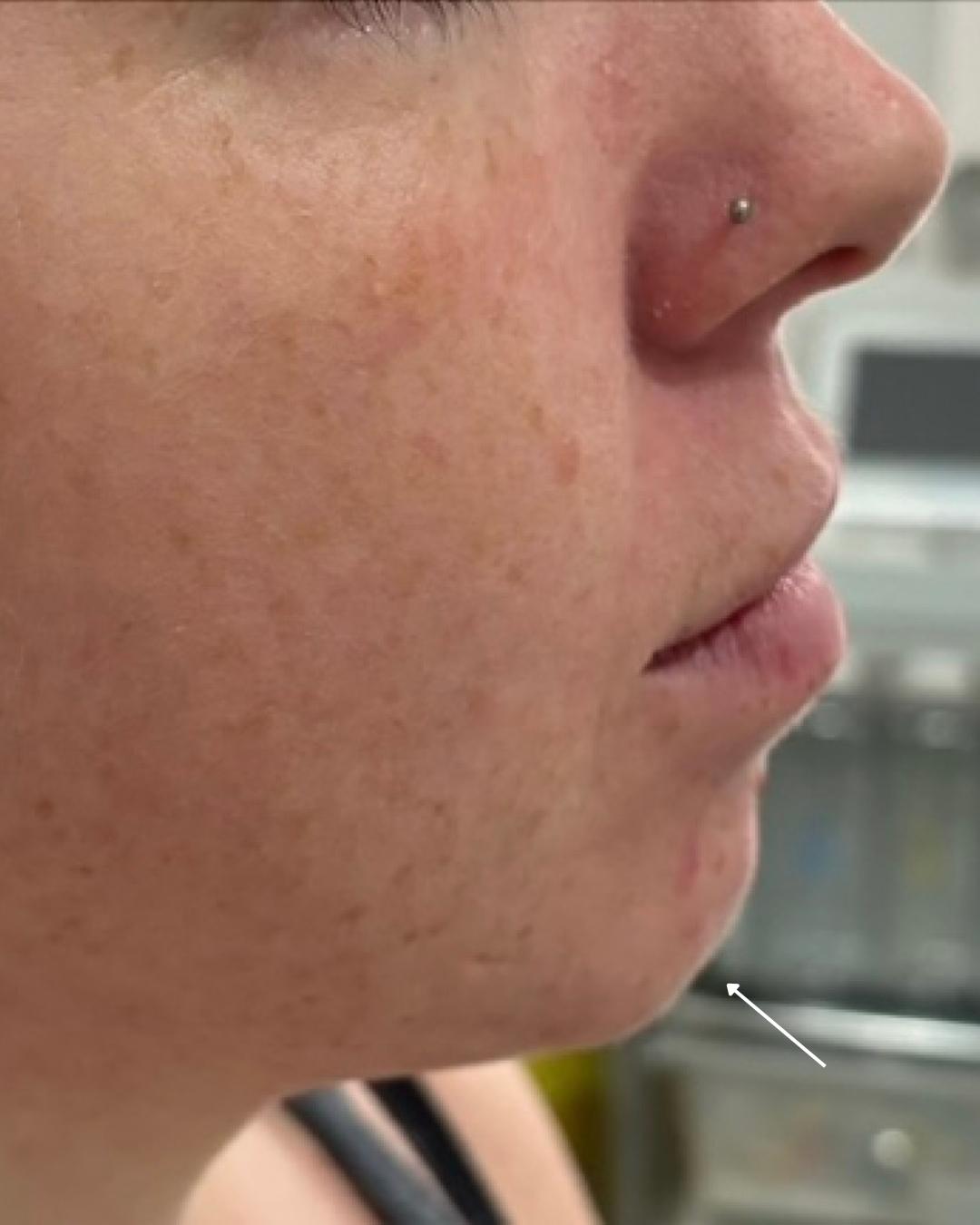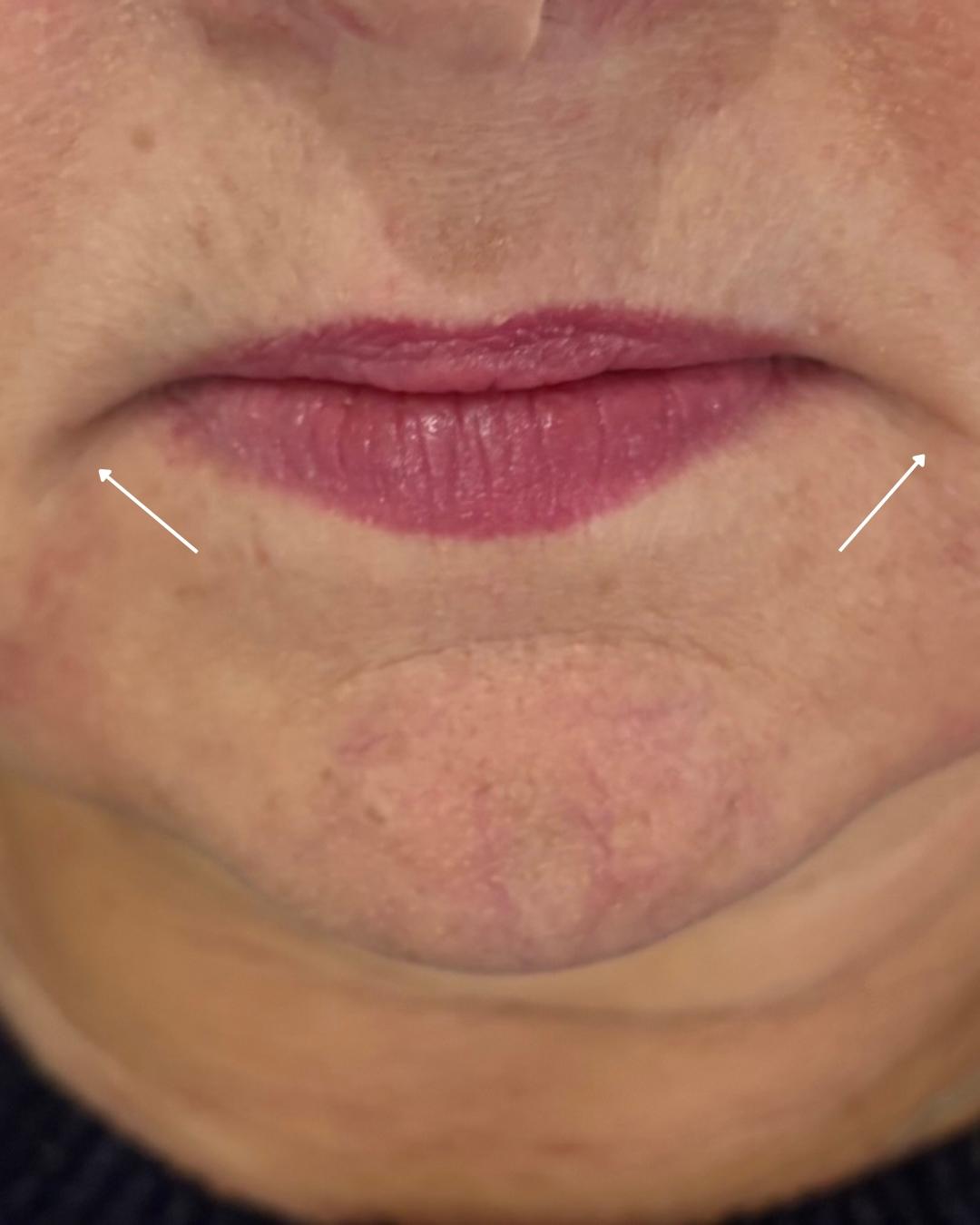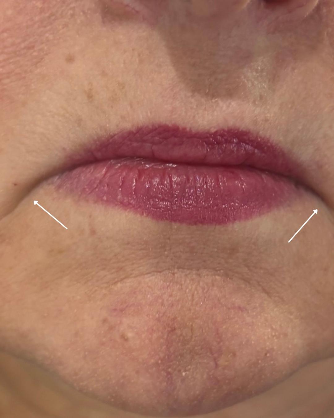 Dermal filler treatment to improve lower face balance by softening the appearance of downturned mouth corners.