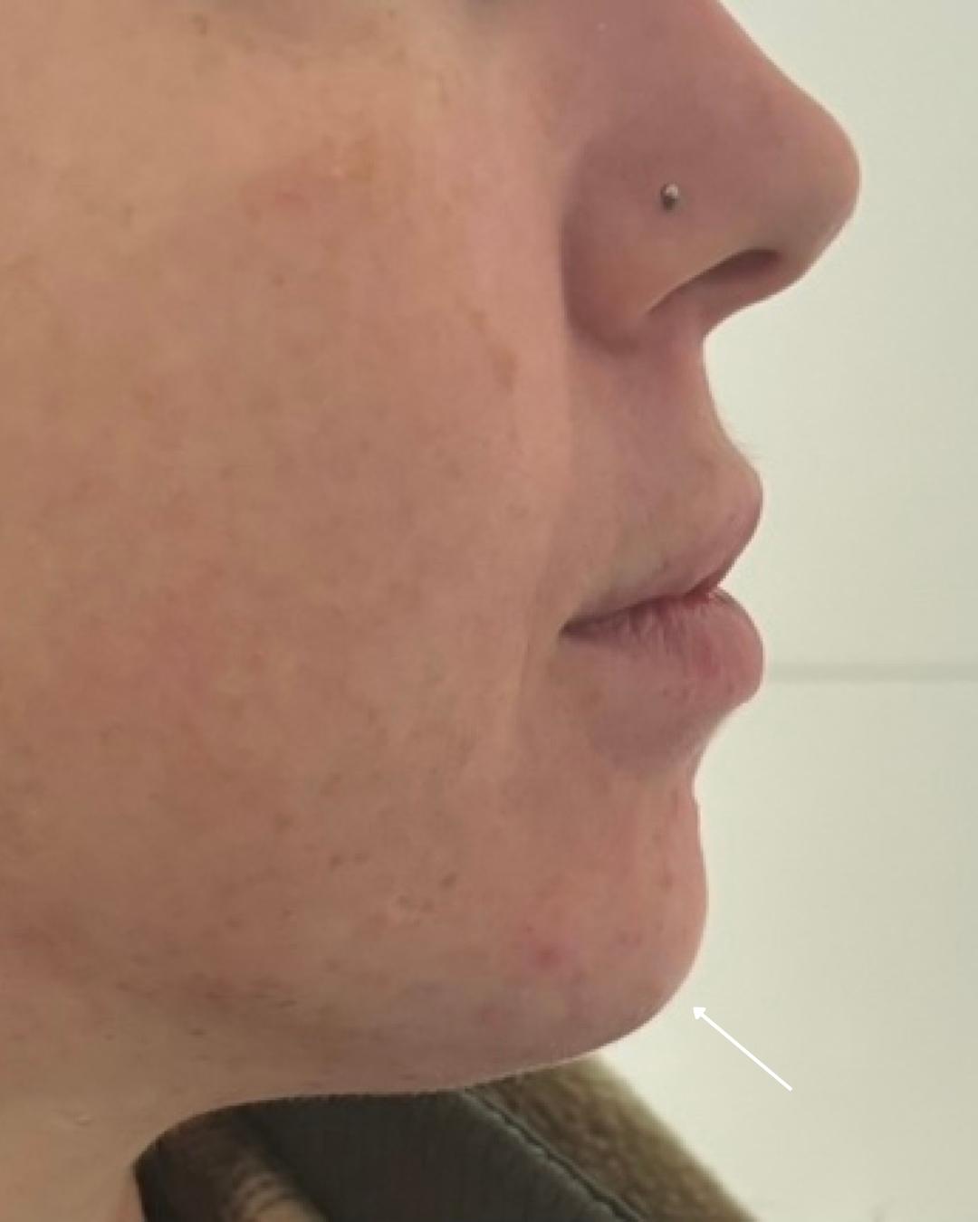 Chin filler treatment to support facial balance and profile definition, with results shown following treatment.